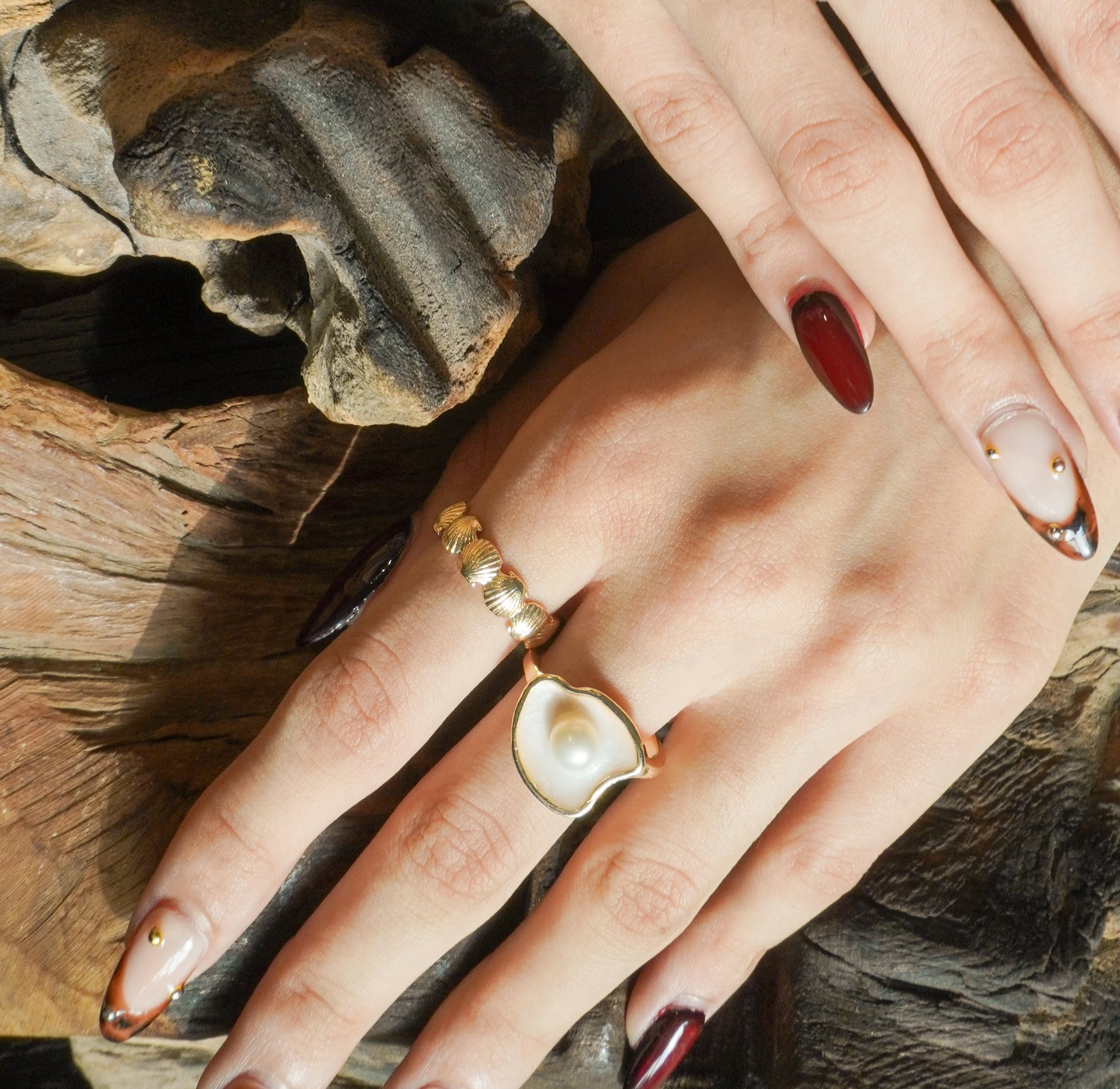 Inspired by the ocean’s treasures, this delicate ring features a row of shell-like motifs in brass with 18K gold plating. A subtle yet unique piece, perfect for everyday elegance.